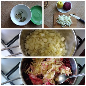 Ставим чайник на огонь, нам понадобится кипяток. В посуду выкладываем перцы и лавровый лист. Заливаем кипятком и накрываем блюдечком. Пусть настаивается. Займёмся икрой. На сковороду наливаем масло, разогреваем его и выкладываем мелко порезанный лук. Золотим его. Свёклу и яблоко натираем на средней тёрке и выкладываем к луку.