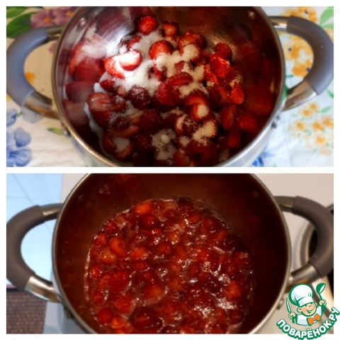 Клубнику помыть, нарезать на кусочки, засыпать сахаром и проварить на небольшом огне три минуты после закипания.
