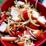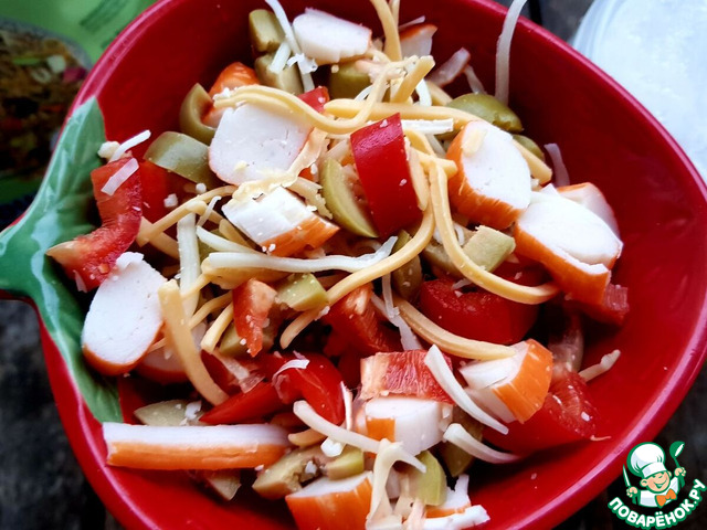 Точнее «For Sveta», что в переводе означает «Для Светы». Или «Светофор». Честно искала на сайте такой рецепт. Не нашла, если есть, приношу извинения. Это для любителей сыра и болгарского перца. Мне салатик очень нравится, ем его на ужин, на работе делали на праздник. Очень яркий! Зимой, когда все серо, темно и грустно – то, что надо.