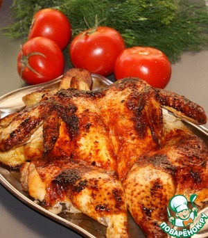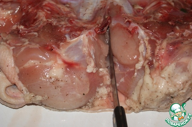 ... и разрезать вилочную косточку, перевернуть разрезом вниз и хорошо придавить руками, чтобы курица "распласталась".
