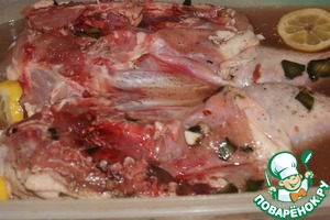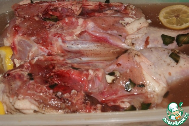 Поместить в емкость и залить водой, в которой растворить соль 3 ч. л. и добавить лимон. Отправить в холодильник на 24 часа. (через 12 часов перевернуть курицу на другую сторону).