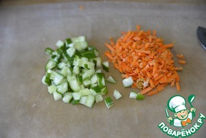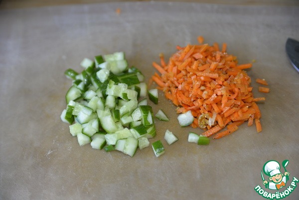 Морковь по-корейски немного измельчаем, огурец режем кубиками.
