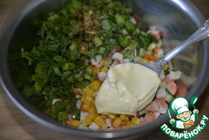 Добавляем майонез, молотую смесь перцев. Перемешиваем.