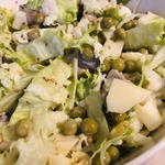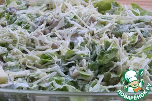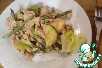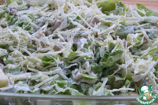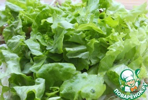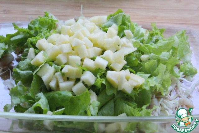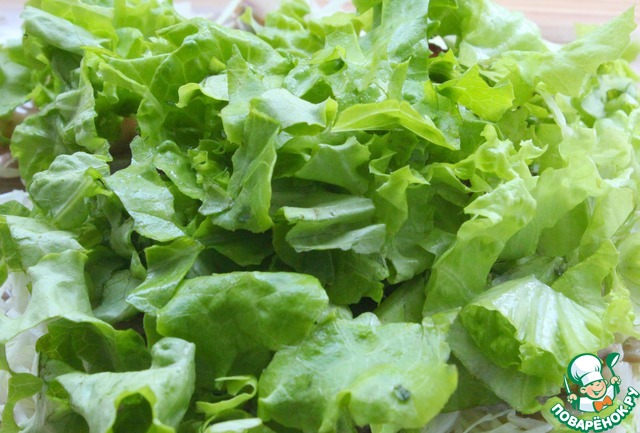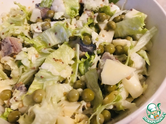 Добавить зеленый горошек и листья салата (оставить чуть для подачи).