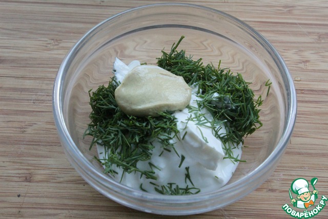 В чашу выложить йогурт, майонез, горчицу, укроп, хрен и перец.