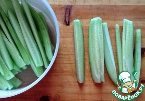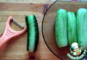 Огурцы помыть, очистить от кожуры с помощью овощечистки.
