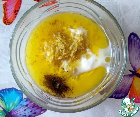 Для соуса соединить йогурт (можно сметану), цедру лимона, лимонный сок, оливковое масло, перец.