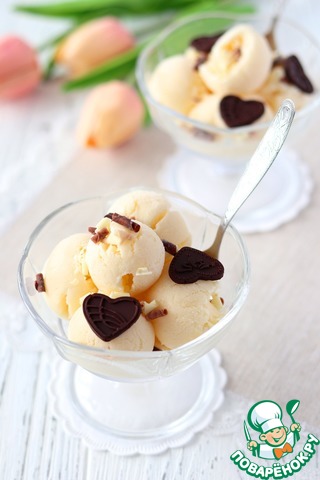 Готовое мороженое посыпать шоколадной стружкой. В данном рецепте использовалась стружка, приготовленная из молочного и темного шоколада. При помощи молд-формы был приготовлен декор в виде шоколадных сердечек.