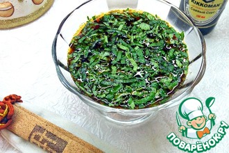 3. В миске соединяем нарубленную зелень, чеснок, сахар, чёрный молотый перец, красный жгучий перец, винный уксус.