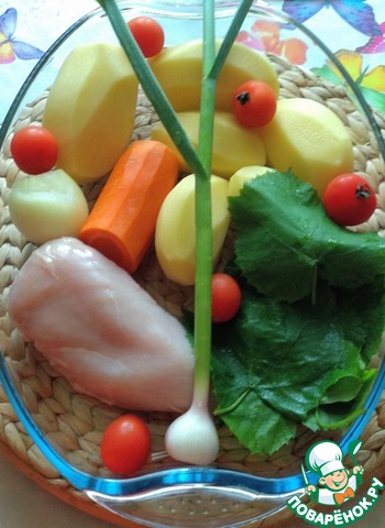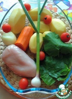 Подготовим необходимые ингредиенты: молодые листья винограда промыть; лук, картошку, морковку почистить, помыть; куриное филе и помидоры промыть.