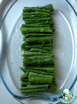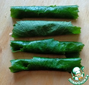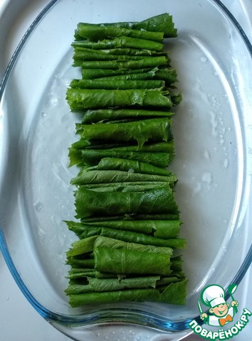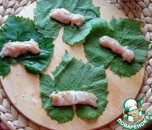 Куриное филе порезать на полоски, обтереть солью и приправой. Разложить на виноградные листья.