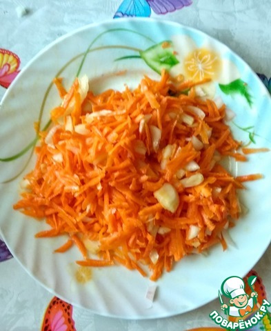 Морковь (70 гр.) натереть на крупной тёрке, лук порезать кубиками, перемешать.