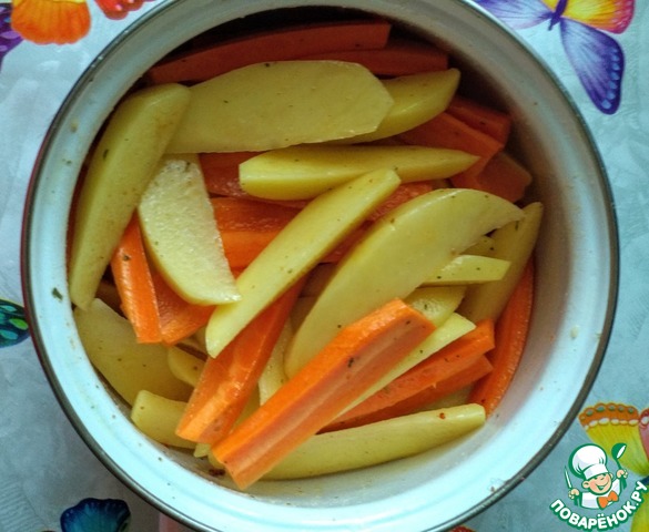 Картофель и остальную морковь нарезать дольками. Смешать в глубокой ёмкости, добавить соль, приправу и оливковое масло. Хорошо перемешать.