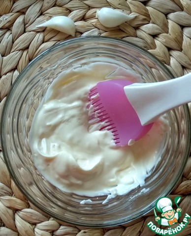 Далее смешать сметану, майонез и чеснок, выдавленный через пресс.