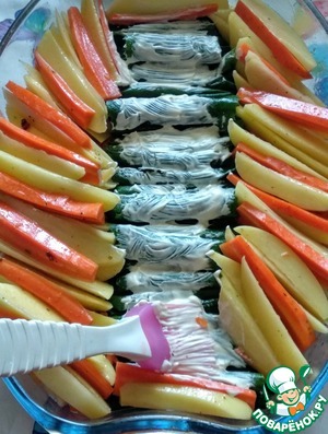 Разложить рядом с рулетиками, это послужит "подушкой" для картофеля и остальной моркови.