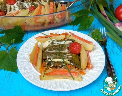 Начало лета пора созревания виноградных листьев, они ещё тоненькие, совсем нежные, их не надо баланшировать перед приготовлением. Я решила завернуть в них куриное филе, а на гарнир приготовить нежную и ароматную картошечку и морковку.