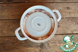 Придавите тарелкой, на тарелку поставьте груз, чтобы всё мясо было покрыто рассолом. Также можно положить мясо с рассолом в пакет, выпустить воздух и завязать пакет. В таком виде отправьте свинину в холодильник для просолки.