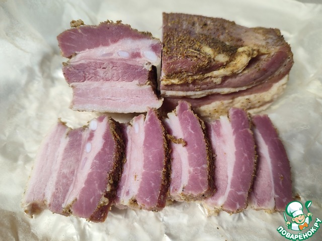Всё делала по рецепту, только закончилась, у меня, смесь для колбасы, взяла приправу для свинины и сухой дым (то же для колбасы покупаю).