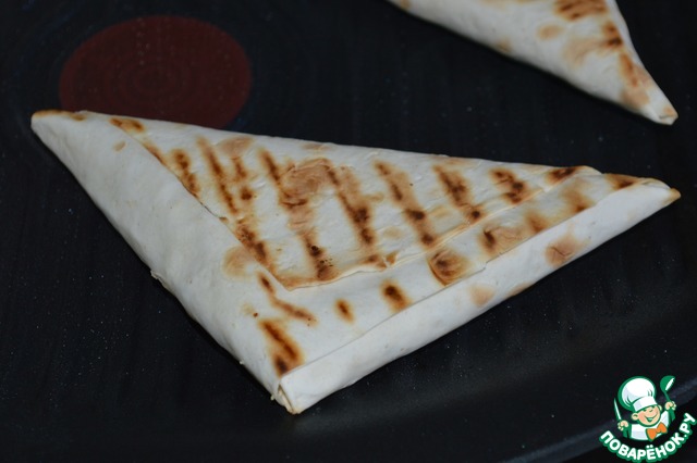 У меня конвертиком, так как лаваш оказался круглым и жарила на обычной сковороде, так как сковороды -гриль у меня нет....Но не думаю,что это повлияло на вкус.