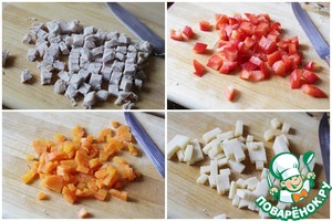 Аналогично нарезать сладкий перец, отварную морковь и сыр. -