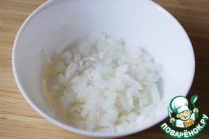 Белый сладкий лук мелко нарезать и по желанию замариновать в уксусе.