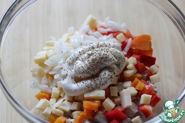 Добавить майонез и молотый черный перец по вкусу и хорошо перемешать салат.