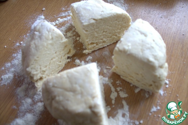 Раскатать первый колобок в тонкий круг, разделить на 8 частей.