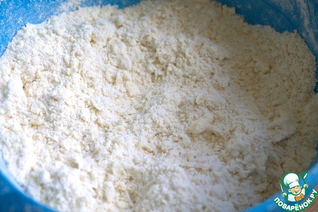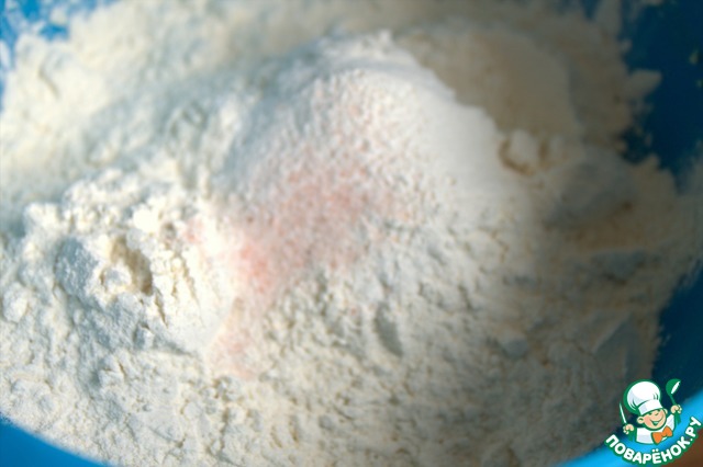Муку смешать с солью, сахаром, разрыхлителем, ванилью.