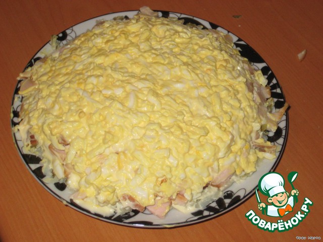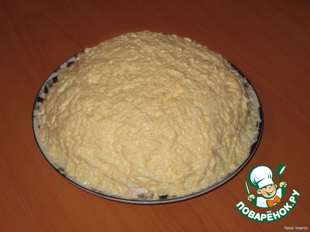 6-й слой - сыр на мелкую терку, перемешать с майонезом и выложить сверху, хорошо разровнять.