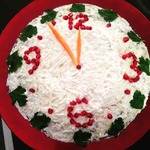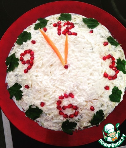 Теперь осталось украсить гранатом (сделать цифры), из перьев лука сделать стрелки, украсить листиками петрушки (или укропа).