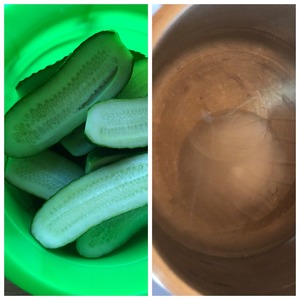 Огурцы разрезать пополам и выложить сверху на специи. В ковше вскипятить воду с маслом, солью и сахаром.