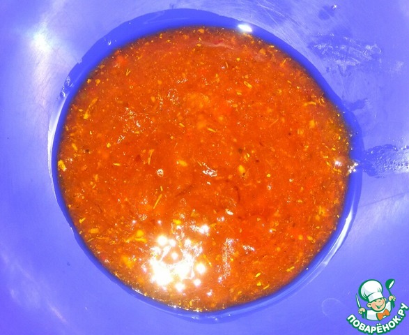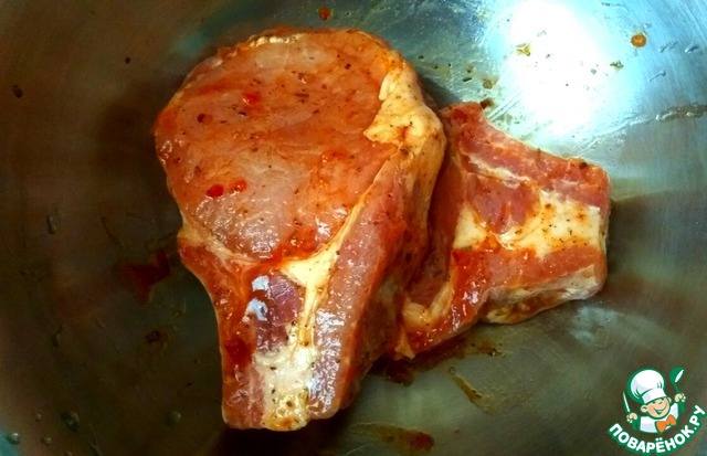 Затем положить мясо в маринад, хорошо помазать со всех сторон. Оставить мариноваться на пол часика (можно и на ночь в холодильнике оставить). -