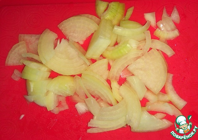 В сковороде, после обжарки мяса поджарить пару минут лук, нарезанный четвертькольцами.
