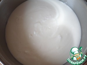 Тонкой струйкой влить горячее молоко с агар-агаром, во взбитые белки и продолжить взбивать до полного перемешивания. Смесь будет горячая, но её не остужать. (Работать нужно очень быстро).