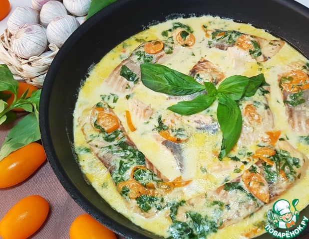 Рыба в ароматном сливочно-чесночном соусе с томатами и шпинатом — блюдо, которое должно побывать на вашем столе. Но самое приятное что готовится оно очень быстро.