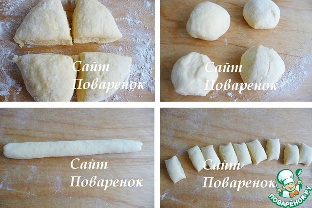 Раскатать в жгут (колбаску), нарезать на небольшие кусочки. -