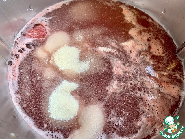 Добавьте в кастрюлю воды, столько чтобы получилось всего 1,5 л ( у меня клубника была довольно сочная, я добавила 700 мл воды), всыпьте пачку желатина, хорошо перемешайте.