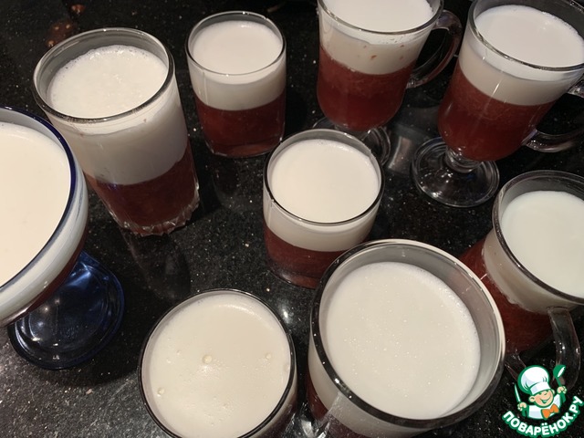 Достаньте из холодильника клубничное желе и залейте молочной смесью, поставьте в холодильник до полного застывания.