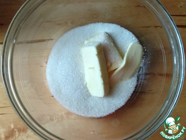 В миску высыпать сахар и добавить размягчнное сливочное масло.