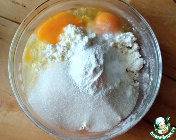 Для начинки в ёмкости соединить творог, яйца, сахар и крахмал.