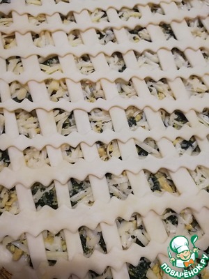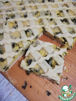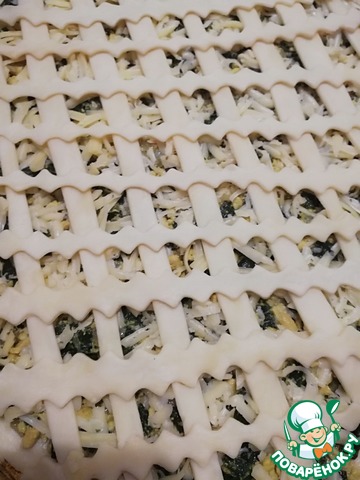 Меньшую часть теста раскатать, разрезать на полоски и выложить решёткой поверх пирога.