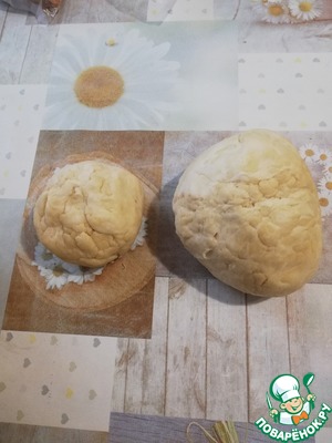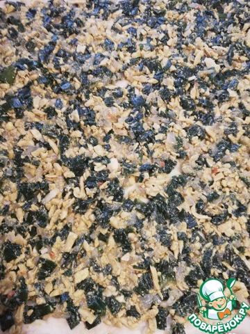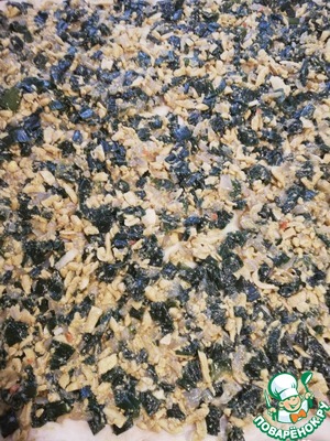 Из данного количества пирог получается большой на размер стандартного противная. Итак, противень смазать маслом или выстелить бумагой для выпечки. Большую часть теста раскатать по размеру противня. Выложить начинку.