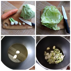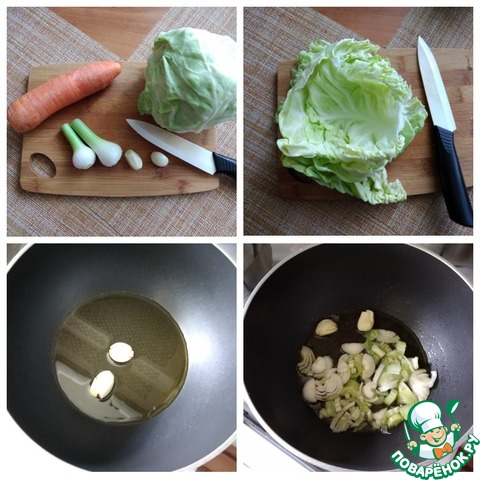 Пока варятся грибы и картофель, паралельно делаем заправку к щам из овощей. Нам понадобится кастрюля с толстым дном, в которой мы сначала будем томить овощи, а затем доваривать суп. Если нет такой, воспользуйтесь любым сотейником или сковородой для тушения овощей. Готовим овощи. Наливаем масло, греем его и выкладываем раздавленные дольки чеснока плоской стороной ножа. Через минуту, когда чеснок отдаст свой аромат маслу, его можно убрать. Я сделаю это чуть позже. Далее выкладываем лук, золотим его. От капусты я отделила целые листья и тонко их нашинковала. Длинными не нужно их резать, чтобы удобно было есть и брать в ложку.