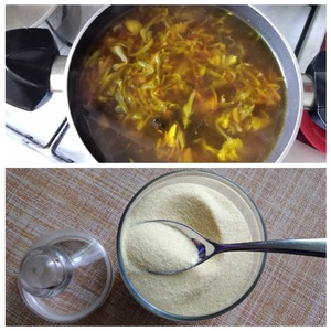 Сразу, постоянно помешивая в центре кастрюли, всыпала манную крупу. Она сделает бульон насыщенным и загустит его немного. Накрываем крышкой. Через пару минут снимаем кастрюлю с огня. Больше не варите, а то капусту переварите! Даём щам постоять.