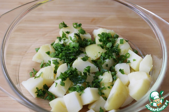 Петрушку и зеленый лук мелко нарезать и добавить к картофелю.