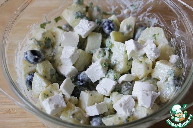 Добавить в салат, очень аккуратно перемешать и подавать.