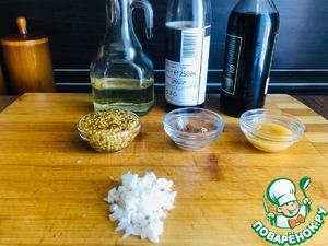 Для заправки нам понадобится: растительное масло, бальзамический крем - соус, винный уксус, мёд, чеснок ( мелко порубить), соль, чёрный молотый перец, красный жгучий перец, сушёный имбирь, дижонская горчица. -