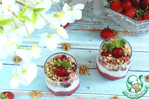 Перед подачей сверху положить порезанную на кусочки черешню и посыпать рубленными орешками. Украсить по желанию и подавать к столу.