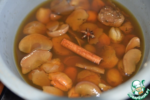 Сухофрукты тщательно промываем, заливаем водой, кладём корицу и бадьян, доводим до кипения и варим на медленном огне при закрытой крышке 20 минут. Далее процеживаем через сито - отделяем ягоды.
