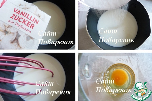 Сотейник с молоком вернуть на плиту, влить струйкой яично-мучную смесь, постоянно помешивая венчиком, чтобы не пригорело. -